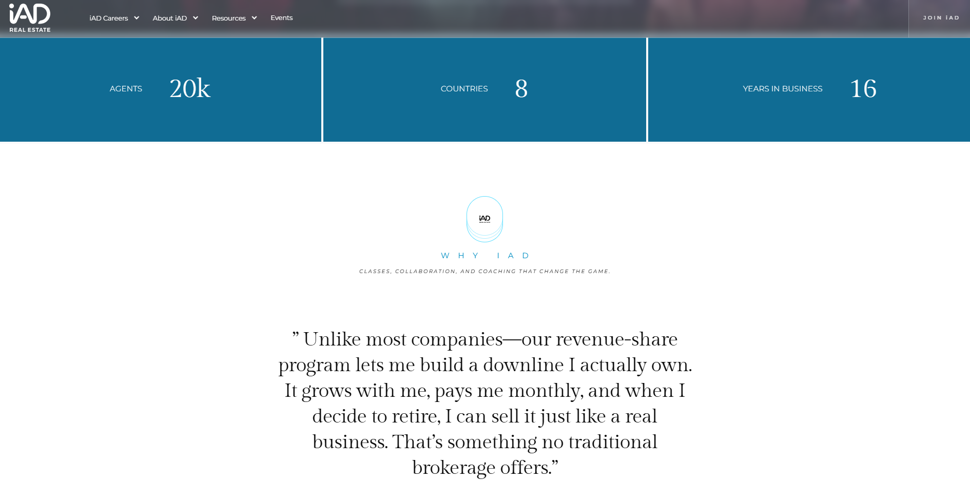 Most brokerage recruitment sites read like MLM pitches — big numbers, aggressive headlines, stock photos of people high-fiving. iAD needed the opposite: a site that felt like an invitation to a peer group, not a sales funnel.